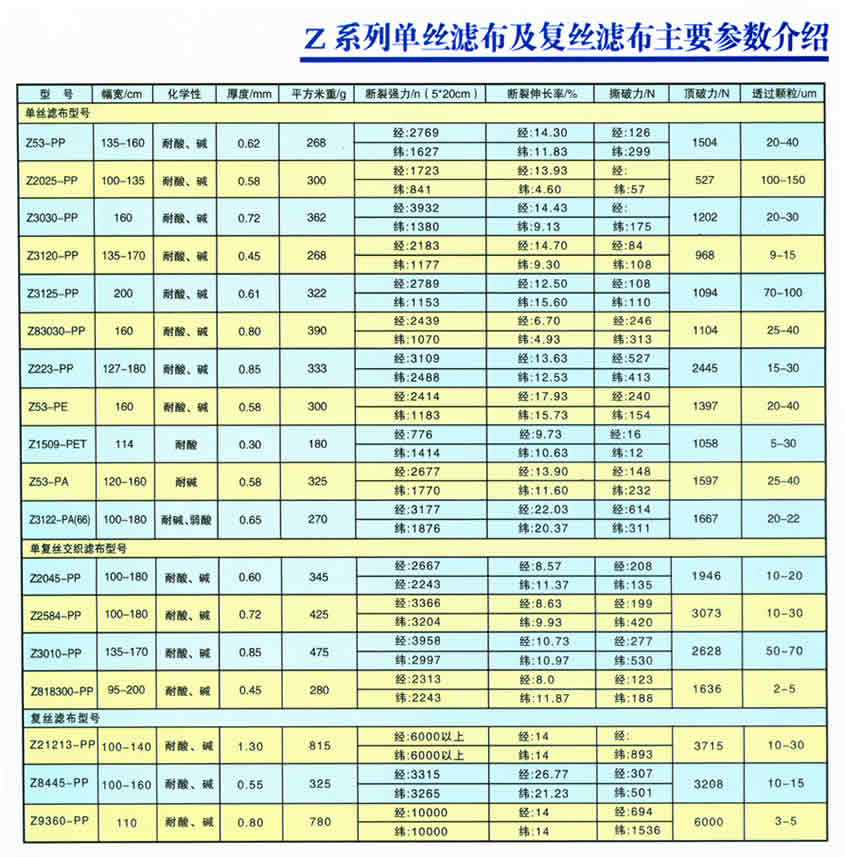 Z系列單絲濾布及復(fù)絲濾布主要參數(shù)介紹